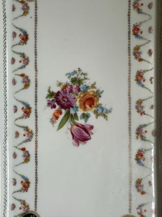 Bandeja de porcelana fina, rectangular, antigua Royal Vienna con sello y número grabado en el dorso, en perfecto estado de conservación