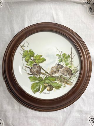 Maravillo plato de Johann Seltmann con su soporte en madera, lleva el sellos “Von Schierholz” famosa fábrica de porcelana Von Schierholz’sche Porzellan Manufaktur, una de las más antiguas de Turingia (Turingia) adquirido en 1906 por Johann Seltmann. 📖Pertenecen a una edición limitada inspirada en la fauna y flora, específicamente centrados en pájaros, y pintados y firmados por el artista de renombre H.Arndt, pintor e ilustrador conocido por sus obras de naturaleza y vida silvestre, especialmente aves y flores. 📏El plato mide 20 cm y 27 incluyendo el marco. Set de plato con marco, 19€/set.