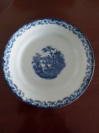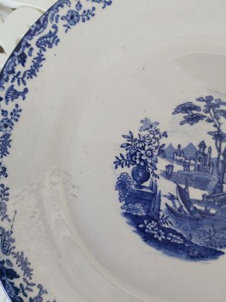 Conjunto de vajilla antigua con un diseño floral azul. - Piezas con sello de autenticidad. - Diseño clásico y elegante. - Compuesta: 13 platos planos 2 fruteros 1 hondo 3 fuentes 1 sopera con las asas laterales rotas