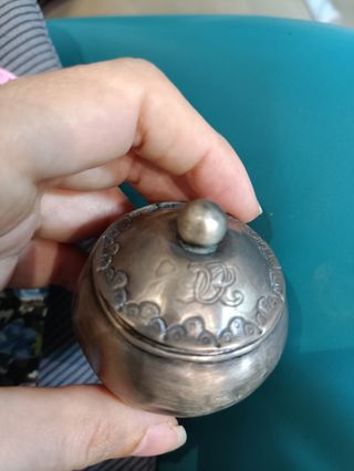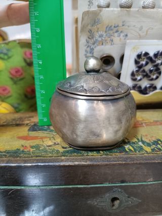 artículo antiguo vintage . envase , recipiente , caja vieja , joyero pequeño. parece una olla en miniatura como un juguete . lleva sellos . cofre . ag . desconozco si cenicero de bolso ? . pastillero ? . artículo de colección Ancient , antico , antic , antiguo , vechi , uralt .