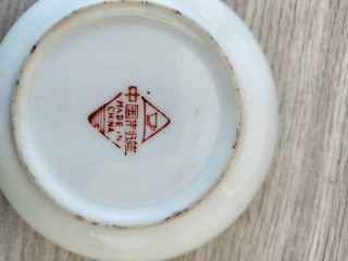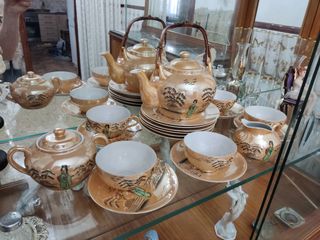 Juego de té o café en fina porcelana china. El juego se compone de 6 tazas con sus platos respectivos pero hay una rota en dos ( se podría pegar). Además lleva la tetera con asa de bambú, para el azúcar y para la leche. Lleva un sello o letras chinas en el reverso de las piezas. Muy ligera.