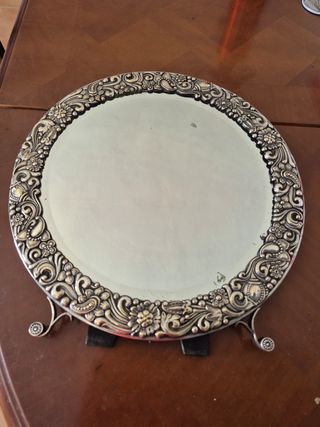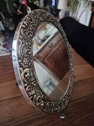 Precioso espejo de sobremesa antiguo, el marco labrado con baño plata, marcado M.H. MTL. Plateado G. Primera mitad siglo pasado. Espejo biselado. Tiene un diseño labrado muy detallado y elegante.- El significado del sello aparece en el reglamento de 1935, en el que se indica que los chapados deberán definirse con la expresión plateado que aparecerá, junto a la leyenda Mtl (Metal plateado), acompañado de una G (cubierta galbanica). - Espejo circular. - Marco con diseño floral. - Pie de apoyo.-