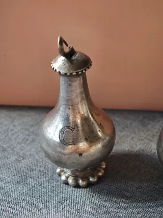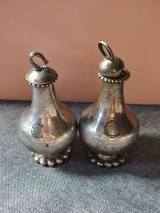 Par de crismeras antiguas, S.XVIII Presentan un diseño clásico y elegante. - Material: Metal plata. - Inscripción: Una 'C' y una 'O' grabadas en cada pieza. Obito y Bautismo. - Base decorada con motivos de perlas del mismo material. - No piezas de segunda mano, herencia familiar. - Contiene todavía aceite en estado rancio. - 8 ctm de altura. - Estás piezas no llevan sello de contraste. Peso 120grs