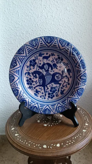 Plato decorativo de la prestigiosa firma Lufeco (Manises, Valencia). Una pieza clásica de la cerámica española, ideal para coleccionistas o decoración rústica/vintage. Motivo central de jinete medieval en azul cobalto sobre fondo blanco/hueso. Pintado totalmente a mano (con sello de autenticidad en la base). Acabado: con efecto craquelado original de fábrica que le aporta un carácter antiguo y elegante. Sirve como decoración o como frutero debido a su gran formato. Excelente estado de conservación, sin desconchones ni grietas. Incluye cordón posterior para colgar directamente en la pared.