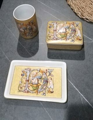 conjunto de bandeja, lapicero, y cajita para un escritorio o entrada de porcelana, es de vistalegre comprado en Portugal y grabado cada pieza por debajo con su sello. son piezas preciosas y están intactas de no haberse usado.