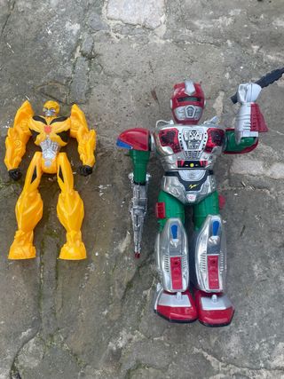 Dos robots de juguete antiguos, ideales para coleccionistas. El amarillo es del 2013 pero el otro es de los años 2000 aunque no tiene el sello lleva muchísimos años por casa y se nota la antigüedad. Este último tiene el brazo roto. - Robot amarillo estilo Transformers. - Robot multicolor con detalles plateados y rojos.
