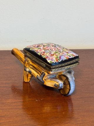 Antigua cajita de Limoges con forma de carretilla, pintada a nano. Está sellada en la base. Medidas: largo 8,5 cm ancho 4,5 cm alto 4 cm Cajita de colección.