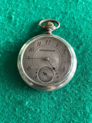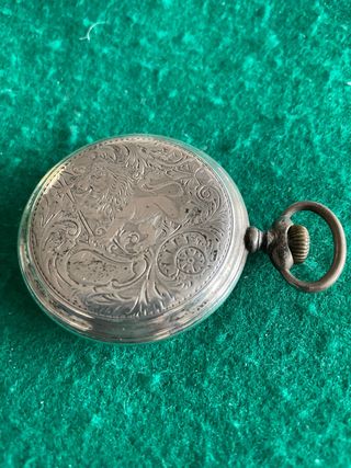 Reloj antiguo con grabado en su trasera funcionando perfectamente de plata 800 micras con su sello y maquinaria made in Suiza con sello del relojero K&L