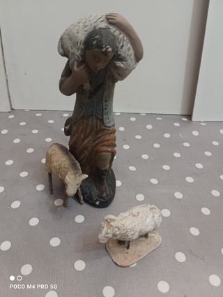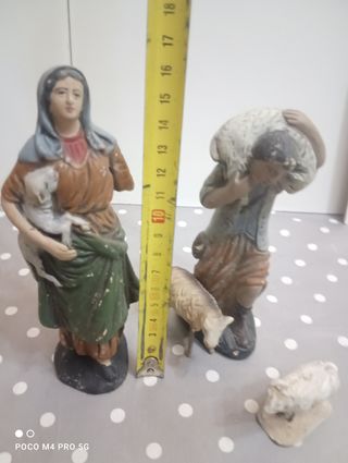 antiguas figuras belén, barro años 30. sello de artesanía serrano en la base. medidas en la imagen. se incluyen dos ovejas muy antiguas. en el lote.