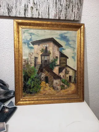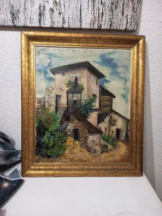 Pintura al óleo de un paisaje rural con una casa antigua y vegetación exuberante. La obra está enmarcada en un marco dorado. - Representación de una casa de campo con detalles arquitectónicos. - Tonos cálidos y terrosos predominantes. - Cielo azul con nubes.