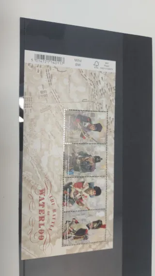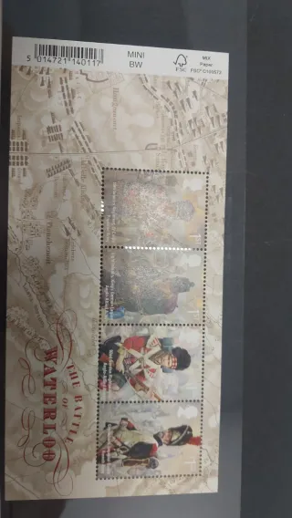 Conjunto de sellos conmemorativos de Jersey Post que celebran la Batalla de Waterloo. - Diseño detallado con ilustraciones de soldados. - Incluye mapa de fondo de la batalla. - Edición especial Mini BW.