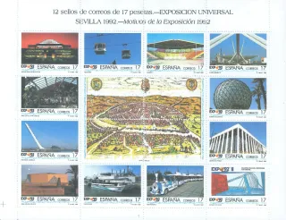 Mini pliego de sellos conmemorativos de la Exposición Universal de Sevilla 1992. - Incluye 12 sellos de 27 pesetas. - Motivos de la Exposición 1992.