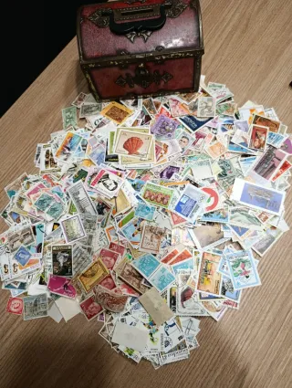 Colección de 2000 sellos de distintas partes del mundo también España, hay repetidos entre ellos, gran variedad para poder pasarlo bien seleccionándolos y clasificando, ver fotos PD Se incluye cajita hucha de la foto