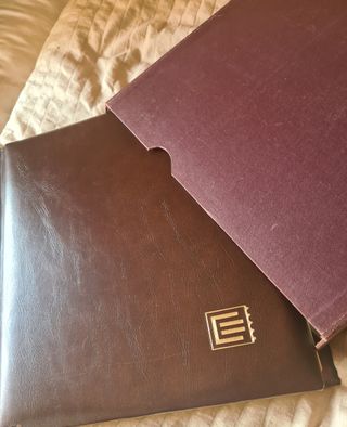 Dos álbumes para sellos, uno de ellos con la palabra ESPAÑA en la portada. Ambos álbumes son de color rojo oscuro y parecen estar en buen estado, aunque uno muestra señales de desgaste. - Ideales para coleccionistas de sellos. - Perfectos para organizar y proteger tu colección. - Dos álbumes incluidos. Del 1965 al 1979. Negociable
