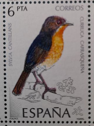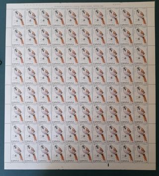 Se ofrece una hoja bloque de sellos de España de 1985. Emision pájaros. Los sellos muestran la imagen de un roquero rojo. - Son 80 sellos en total. - En perfecto estado de conservación.