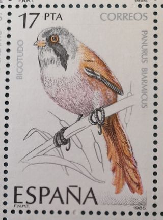 Se ofrece una hoja bloque de sellos de España. Los sellos muestran la imagen del pájaro bigotudo. - Son 80 sellos en total. - Edición de 1985. - En perfecto estado de conservación.
