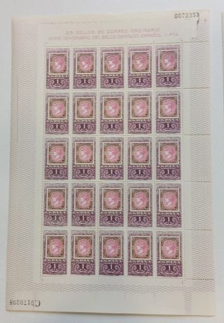 Lote de pliegos sellos conmemorativos del Centenario del Sello Español. NUFILART sellos. - Varios diseños y colores. - Hojas de 25 sellos cada una. - Incluye sellos de 1 PTA y 80 CTS. pliegos españoles España sellos Isabelas católica centenario Isabel II Amadeo I gobierno provisional República Alfonso XII Alfonso XIII numismática compramos billetes compramos monedas.