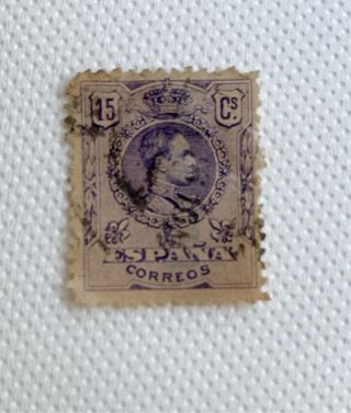 Se vende precioso sello antiguo de españa de 15 céntimos violeta de 1909 de Alfonso XIII matasellado,con número de control en el reverso,con dentado muy desplazado y en buen estado de conservación.