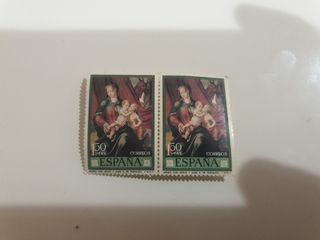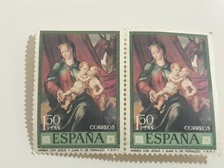 Se venden dos sellos antiguos de España. Son de 150 pesetas y muestran la imagen de la Virgen con Jesús y Juan. Los sellos están en perfecto estado de conservación. - Tema: Virgen con Jesús y Juan de L. Morales - Valor facial: 1.50 pesetas - País: España - Cantidad: 2