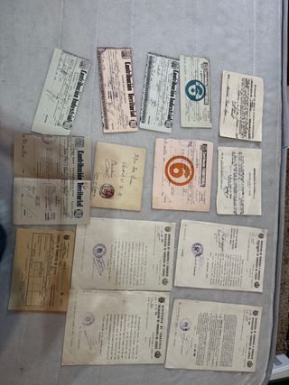 Conjunto de documentos antiguos, incluyendo recibos de Contribución Territorial e Industrial. - Varios documentos con sellos y escrituras. - Algunos con el número 6 visible. - Papeles con texto en español.