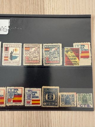 Conjunto de sellos de la Guerra Civil Española. - Incluye varios sellos con diferentes diseños y valores. - Algunos sellos muestran retratos y paisajes. - Presenta sellos con inscripciones como ARRIBA ESPAÑA y HABILITADO PARA. - Se aprecian sellos de 10 céntimos y otros valores.