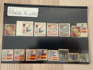 Lote de 14 sellos patrióticos diferentes de la Guerra Civil Española. - Sellos conmemorativos de eventos y figuras de la época. - Incluye sellos de Huesca, La Coruña, Tarragona y otros. - Temáticas como Arriba España, Primer Año Triunfal y Aniversario del Alzamiento. - Algunos sellos datan de 1937 y 1938. gastos de envío 1€