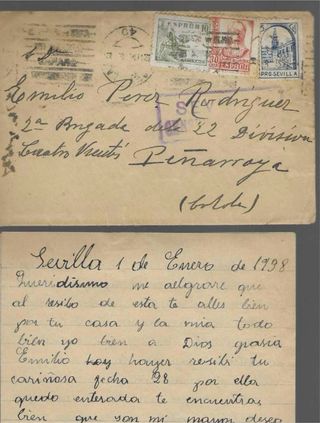 CARTA Y SOBRE CIRCULADA DE SEVILLA A PEÑARROYA-CUATRO VIENTOS-CORDOBA- 2º BRIGADA-22 DIVI, VER FOTOS Carta y sobre original de Sevilla con fecha de 1 de enero de 1938, en plena Guerra Civil Española. La carta está escrita a mano y dirigida a Emilio Pérez Rodríguez. Muy rara y poco vista - Sello de España. - Matasellos de Sevilla. - Dirección escrita a mano. - Contiene el sobre y la carta.