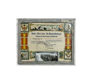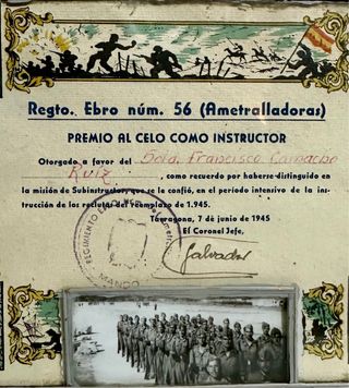 España, General Franco, diploma instructor de ametralladoras. Premio concedido a D. Francisco Camacho Ruiz del Regimiento de infantería Ebro número 56 de Ametralladoras por su celo como instructor. Firmado de puño y letra en Tarragona el 7 de junio de 1945 por el Coronel Jefe del regimiento D. Manuel Salvador Ascaso, que participó en la guerra de Marruecos y en la guerra civil, posteriormente fue Gobernador Militar de Tarragona y de otras provincias, Navarra, Álava, General de Brigada y División y Gobernador Civil de Vizcaya. Lleva el sello del regimiento. Decorado con bonitos dibujos y fotografías militares. Enmarcado artesanalmente lleva cristal. Mide, 20,7x16,5 cm. Buen estado con señales normales del paso del tiempo. (ejército militar uniforme documento papel nombramiento medalla emblema distintivo arma armamento frente soldado oficial).