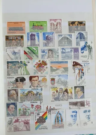 Conjunto de sellos españoles de la época contemporánea. - Varios diseños y temáticas. - Incluye sellos con retratos y monumentos. - Algunos sellos muestran el valor en pesetas (PTA). - Se aprecian sellos con la inscripción ESPAÑA y CORREOS.