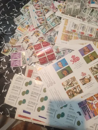 Se vende colección de sellos de España, incluyendo dos álbumes España 1979 bloque de cuatro 13 hojas España 1980 bloque de cuatro 8 hojas España 1981 bloque de cuatro 14 hojas España 1982 ". ". ". 11 hojas España 1983. ". ". ". 13 hojas España 1984. ". ". ". 10 hojas España 1985. ". ". ". 12 hojas España 1986. ". ". ". 16 hojas España 1987 ". ". ". 17 hojas España 1988 ". ". ". 21 hojas España 1989. ". ". ". 19 hojas España 1990. ". 23 hojas España 1991. " 8 hojas Y unos cuantos más
