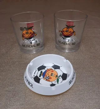 (Nuevo)-Conjunto de dos vasos y un cenicero conmemorativo del Mundial de Fútbol España 82 -Dos vasos de cristal con diseño de Naranjito y Mundial 82 Los vasos son los Números 4 y 6. -Un cenicero blanco con diseño de balón de fútbol y Naranjito, con España 82 -4 Sobres Copa Mundial de Fútbol 82 Primer día de circulación Edición especial.Fecha emisión el 2 de Mayo de 1981.Sellos España 82 con valor de 12 y 30 pesetas.Los sobres son Estadio Santiago Bernabeu Madrid Estadio Luis Casanova Valencia Estadio Vicente Calderón Madrid Primer día de Circulación España 82 -24 Banderines Campeonato Mundial España 1982. Santillana,Arconada,etc..