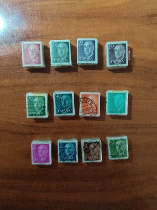 Lote de 12 pastillas de 100 sellos usados cada una. Serie básica del general Franco, de 1955.Valores:10,20,25,60,70 y 80cts. 1,1'5,2,3, 5 y 10 pts. Ideal como coleccionismo y conseguir variedades de color ó errores.Util en scrapbooking. Manualidades, decoración o reventa.