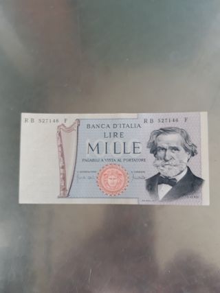 Billete de 1000 liras italianas emitido por el Banco de Italia. - Serie RB 527146 F. - Ilustra a Giuseppe Verdi. - Presenta un arpa y un sello con la cabeza de Medusa.