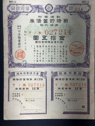 Bono de guerra japonés de 5 yenes, emitido en 1942. - Número de serie: 026982. - Emitido por el Banco de Fomento de Japón. - Fecha de emisión: Febrero de 1942 (Showa 17). - Título: Bono de Guerra Nacional - Sello: Gran Este de Asia Guerra - Incluye el cupón de pago.