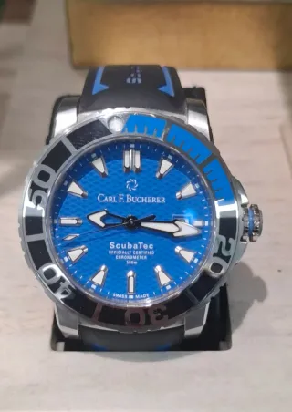 Reloj de buceo Carl F. Bucherer ScubaTec con certificación oficial de cronómetro. - Esfera azul. - Bisel giratorio. - Correa de caucho. - Resistencia al agua de 500m. Reloj Nuevo a estrenar, full set, con caja y documentación, con toda la garantía internacional que es activada electrónicamente y sellada por distribuidor oficial de la marca el mismo día de la compra. Pvp 6250€, es tuyo por solo 4900€. Precio fijo NO negociable, NO cambios NI compro relojes, NO contesto ofertas, NO hay tienda física. Envios a toda España, Italia y Portugal. Posibilidad de entrega en mano. Más relojes en mi perfil.