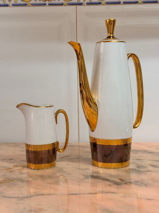 Distinguido juego de café/té de porcelana fina de Limoges, Francia. Las piezas presentan un esmalte blanco de alta calidad acentuado por un patrón decorativo en tonos grises o taupe y un rico baño de oro fino en bordes y asas. La marca en la base es el sello del fabricante "DAE LIMOGES", lo que confirma su autenticidad. El diseño es clásico y elegante, típico de la artesanía de Limoges. El conjunto incluye una tetera/cafetera y dos tazas a juego con sus platillos. - Diseño vintage. - Acabado brillante en oro. - Piezas de alta calidad.