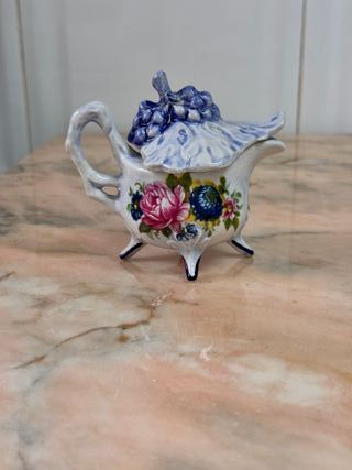 Salsera/cremera vintage italiana de cerámica "Vecchia Fiorentina", estilo Capodimonte, con decoración floral pintada a mano y detalle de uvas en la tapa. Pieza de coleccionista con sello de autenticidad, ideal para servir con elegancia o como objeto decorativo. - Diseño floral pintado a mano. - Estilo Capodimonte. - Piezas de colección.