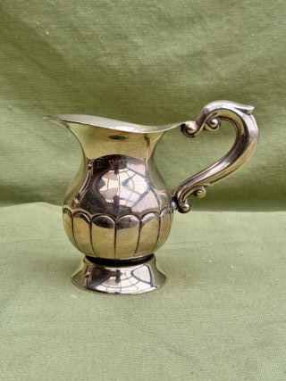 arra pequeña vintage de alpaca plateada de la reconocida marca española Meneses. La pieza, que puede formar parte de un juego de café o té, presenta un diseño clásico gallonado y el sello del fabricante en la base. La alpaca, también conocida como plata alemana, es una aleación de cobre, zinc y níquel con un acabado similar a la plata. - Altura aproximada de 12 cm. - Fabricada en alpaca. - Diseño con base y tapa.