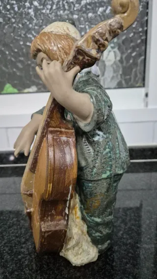 Figura de porcelana de un niño músico de la marca Porcelana Levantina. Lleva su sello de PAL - Detalle de niño tocando un instrumento de cuerda. - Diseño clásico y detallado. Muestra un desperfecto en la parte de arriba del instrumento como se ve en la foto adjunta.lo demás perfecto estado 30 cm