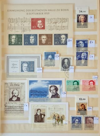 Serie de 4 sellos año 1950, Bicentenario de la muerte de Johann Sebastian Bach, 1.685 - 1.750. Compositor. Serie de 3 sellos año 1952, Compositores Serie de 2 sellos año 1952, 125 Aniversario de la muerte de Ludwig van Beethoven, 1.770 - 1.827 Serie de 2 sellos año 1956, II Centenario del nacimiento del compositor Wolfgang Amadeus Mozart, 1.756 - 1.791 7 hojitas (Minisheet) varias años 1970 a 1986