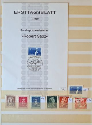 Sellos matasellados Deutsche Post Berlin Año 1950, Reconstitucion de la filarmónica de Berlin. (1 ud.) Año 1952, Ludwig van Beethoven, 1770 - 1827. (1 ud.) Año 1954, V Aniversario de la muerte del compositor Richard Strauss, 1864 - 1949 (3 ud.) Año 1955, Wilhelm Furtwängler, 1886 - 1954. Músico. (2 ud.) Año 1980, Hoja primer dia compositor Robert Stolz. (1 ud.)