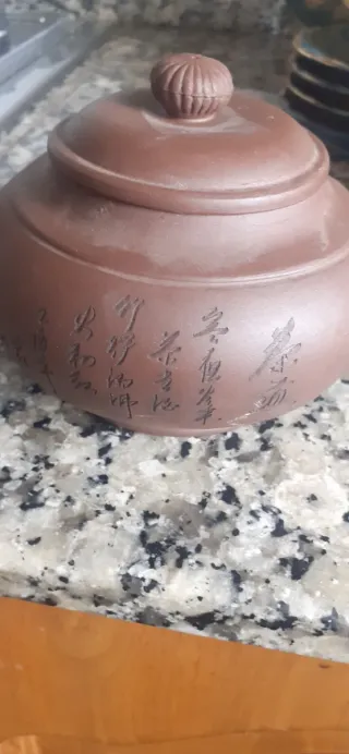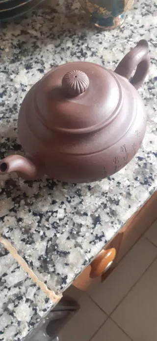 Exclusiva tetera china de Arcilla Yixing (Zisha), famosa por mejorar el sabor del té con el tiempo. Pieza de colección en arcilla Zini (púrpura/marrón) con elegante caligrafía grabada a mano en el cuerpo. Incluye sello de autor en la base y detalles artesanales. Ideal para ceremonias Gongfu Cha o decoración de alto nivel. Presenta una mínima marca de uso en el borde interno de la tapa (ver fotos), casi imperceptible, que no afecta su uso. ¡Una joya para amantes del té o coleccionistas de cerámica oriental! 🍵✨