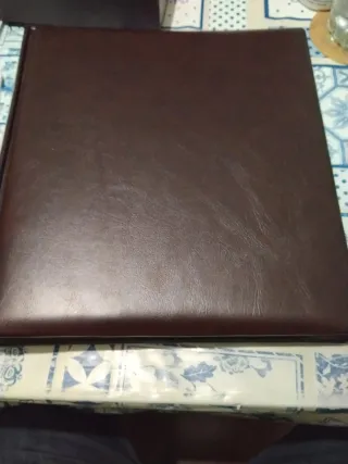 Álbum de coleccionismo de la marca Edifil, modelo Super Lujo. - Cubierta de color marrón oscuro. - Texto ESPAÑA en dorado en el lomo. - Símbolo de la marca en la parte inferior del lomo.