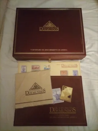 Colección de sellos conmemorativos del' V Centenario del Descubrimiento de America'. "ENCUENTRO DE DOS MUNDOS" - Sellos de plata de ley 925 y bañadas en oro de 22 kilates -Su grosor es de 2,2mm -El contraste, grabado en el reverso, garantiza la pureza de los materiales. - Presentados en un estuche de piel forrado de terciopelo con sitio para cada sello. - Lengueta de nacar . - Colección incompleta. ( falta 1 sello)