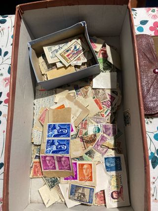 Cajita con una colección de sellos. - Sellos de España. - Variedad de diseños y épocas. y unas cosas que encontré con ellas se ven que son antiguas todas.