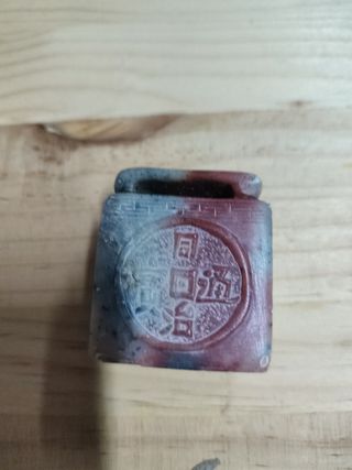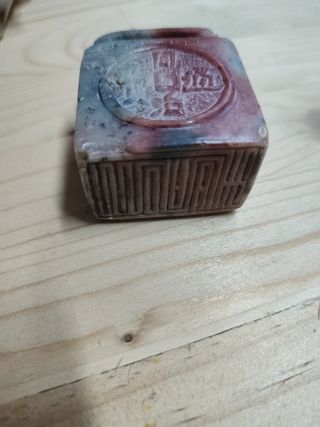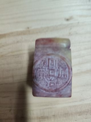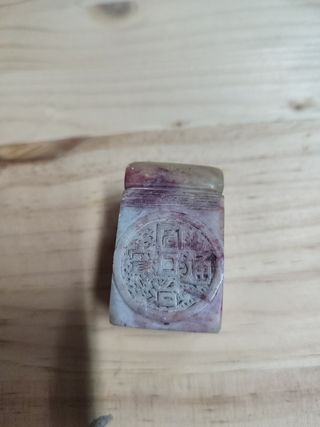 Conjunto de tres sellos orientales tallados en piedra con de orativos dibujos grabados.uno de forma exagonal, otro circular y otro rectangular.