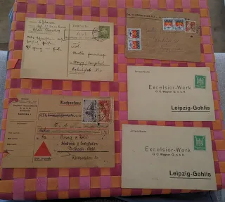 Conjunto de cartas y postales alemanas antiguas. - Postal con matasellos de Saarburg (B. Trier). - Postal con sellos de Excelsior-Werk Leipzig-Gohlis. - Documento de Nachnahme (cobro contra reembolso) de Vereinigte Sauerstoffwerke.