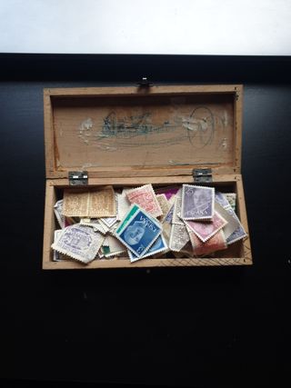 Caja de madera llena de sellos antiguos, hay de todo. Entre 50 y 100 sellos cálculo. La caja y los sellos por 30€.