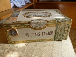 Caja de madera para puros Flor de Farach, vacía. Presenta un diseño clásico con detalles dorados y texto en relieve. - Marca: Flor de Farach - Origen: Habana, Cuba - Decoración: Estampados y sellos de garantía de la República de Cuba
