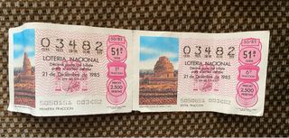 Decimos de lotería de hace 40 años Puede que fueran premiados con el premio gordo o algun premio pero ya no se pueden cobrar 🤷🏻♂️ De la Administración de loteria de la puerta de Sol,La Pajarita. Dos décimos de la Lotería Nacional del sorteo del 21 de diciembre de 1985. Cada décimo es una fracción del billete. - Número de serie: 51ª - Fracción 1ª y 6ª - Precio por fracción: 2.500 pesetas - Dibujo de un monumento histórico en cada décimo.